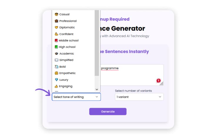 Choose from various writing styles available. Options might include formal, casual, professional, or academic. Selecting the right style ensures the generated sentence fits your desired tone.