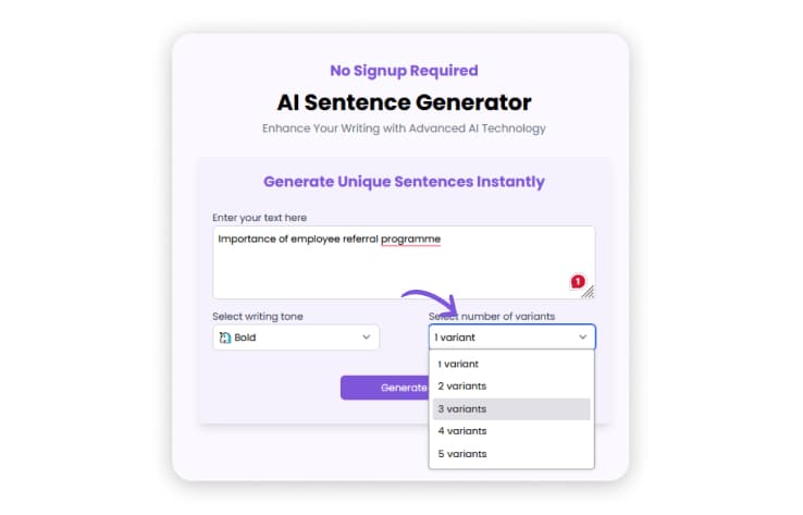 - Use Variants: Experiment with generating multiple variants of a sentence. This can help you find the best possible phrasing for your content. Our tool allows you to generate up to five variants at a time, giving you a range of options to choose from.