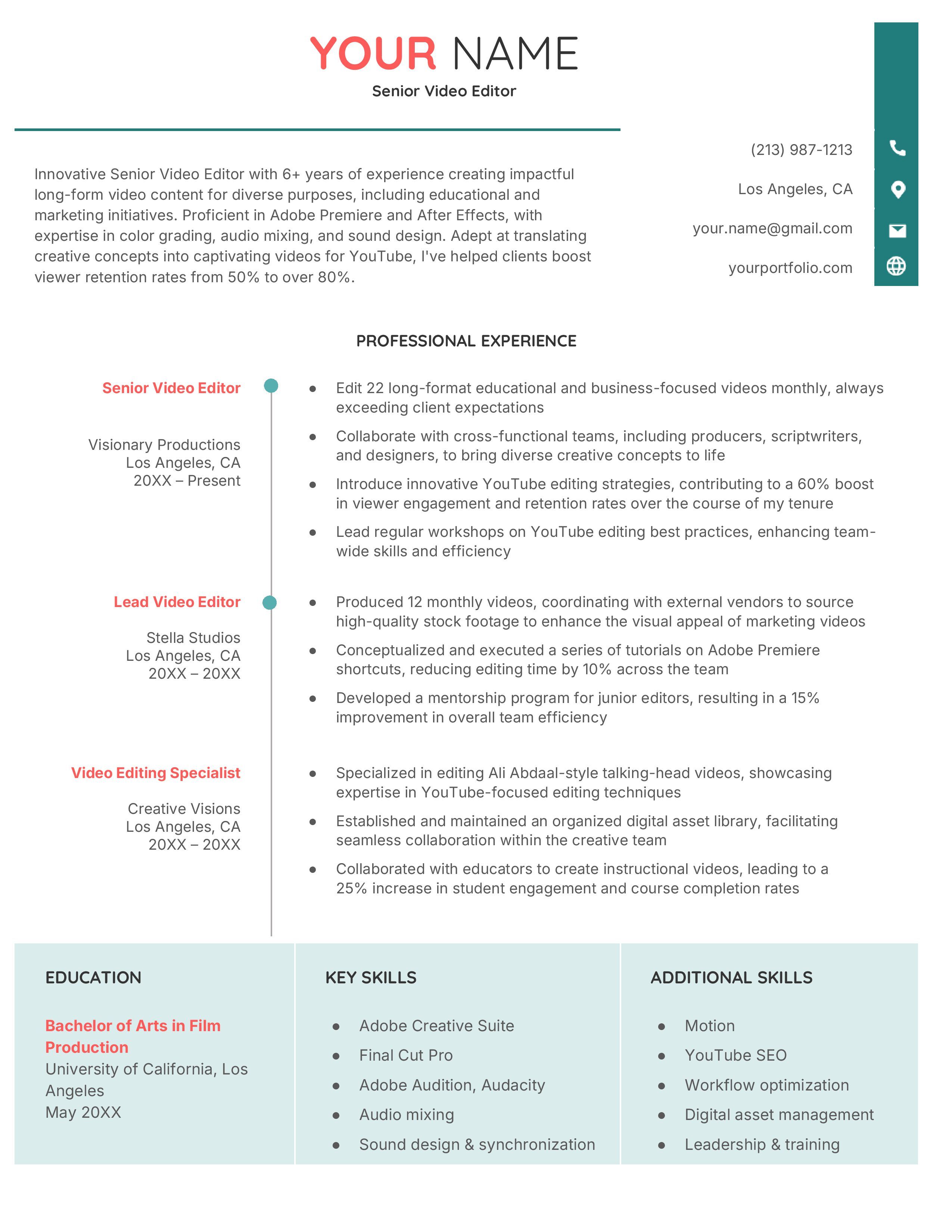 - Careful proofread: Video editing requires minute attention to detail; hence, your resume must contain no errors.